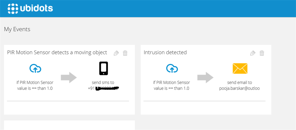 Now we have added an Email and an SMS trigger. Build, upload and run your code on Edison. You will notice data sending to Ubidots in the console. If any motion is detected by the PIR motion sensor it will blink the LED, play the buzzer and an SMS and an Email will be sent to your Phone.