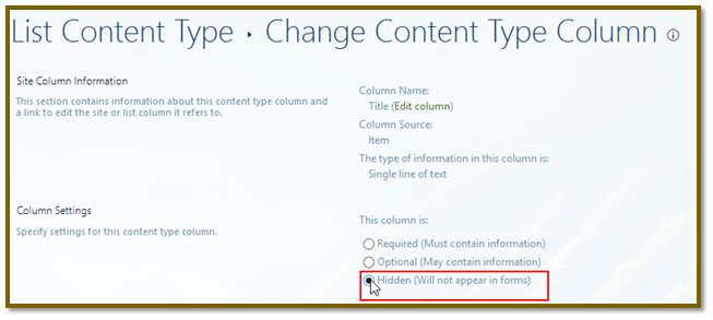 In SharePoint a new list has a Title column by default but most clients do not need it in the project. This article shows how to hide or remove the default SharePoint list “Title” column such that it does not appear in new item forms.Create a new Custom list named NewSPList.Figure 1: New SplitOnce the list has been created by default the title column is in the list. Now click on new item to add items into the list.Figure 2: Defoult Title Add a Title and name to the field and click the Save button. Here our Primary moto is to hide the Title column on this form.Figure 3: Primary MotoAll the item's data is stored in the list as Figure 4.Figure 4: All item dataNow we will hide the Title column in the list. Let us go to List on the Top ribbon then click on the List setting.Figure 5: Top ribbonFigure 6: List Setting The list settings page opens. Then click on Advanced settings.Figure 7: Advanced SettingsSelect the “Yes“ Check box to allow management of Content types.Figure 8: Content TypesBack to the list setting page, you will display a content type item. Click on Item.Figure 9: Click on item9. On the click of Item the content type is displayed. All the columns that were currently created in list are something. Select TitleColumn (by default the status of the Title column in required changes its status to the Hidden type as shown in Figure 10. It will not appear in forms.Figure 10: Title ColumnFigure 11: list Content Type10. And click on OK. Now your default title column does not appear in the new item forms. To hide the Title field from all the item's view, click on All Items on the List Settings page under the Views section.Figure 12: All ItemUncheck Title field from the All Items View page.Figure 13: View PageSee now, you will not be able to see the Title column in the All list items as well as the new item page.Figure 14: New Item PageFigure 15: NameBy using the preceding procedure we can hide the Title column from a SharePoint 2013 Custom list.