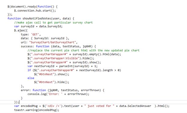 The receiver's showNotitfiedVotes function is called from the server method of the hub and it re-renders the chart for the corresponding survey Id. Also gives a toaster notification of which user voted for which option. Be sure to start the hub connection in the "document.ready" event handler.