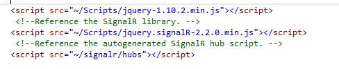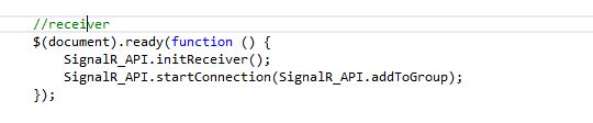 Just to have the SignalR code in one place instead of scattering it over multiple views, I added one JavaScript file, SignalR.API.js, with 3 methods.InitReceiver: contains the receiver's code. Called in the doc.ready event handler of the receiver.InitSender: contains the event handler for the submit vote button.StartConnection(callback): starts a connection and accepts a callback function that is called in the "done" success handler of the start method. Here is how the sender and receiver code looks like now.![]()