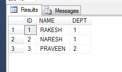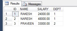 - VALUES('RAKESH',24000,1),('NARESH',48000,1),('PRAVEEN',33000,2)
