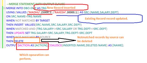 - THEN UPDATE SET TRG.SALARY=SRC.SALARY,TRG.DEPT=SRC.DEPT