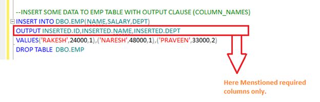- OUTPUT INSERTED.ID,INSERTED.NAME,INSERTED.DEPT
