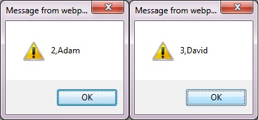 alert(employees[i].Id + "," + employees[i].Name + "," + employees[i].Super + "," + employees[i].Address + "," + employees[i].Dob);