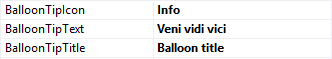- BalloonTipText: the actual text that will be displayed on the balloon tip.