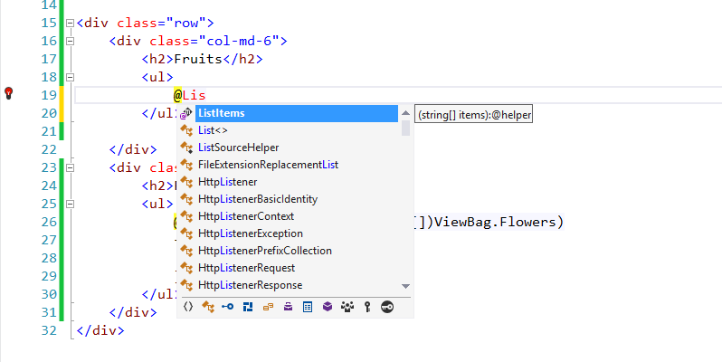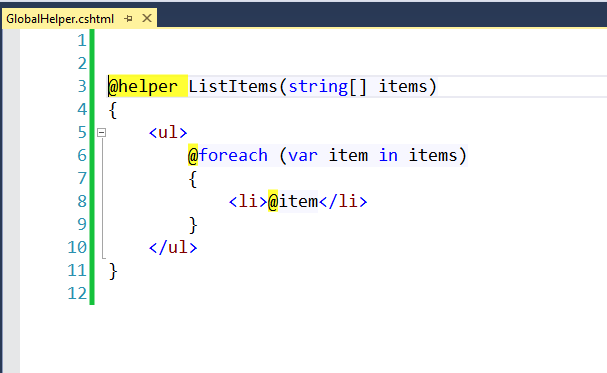 When we compile the code the GlobalHelper.cshtml file will be compiled to a class with ListItems as its static method. We can invoke this global helper method like we invoke a static method of a class in C# as shown below.