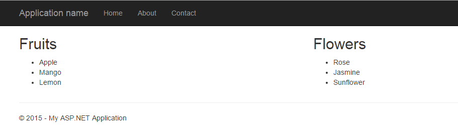 As shown in the preceding code, let`s display the data for the fruits and flowers stored in the ViewBag. The contents of the Index view is as shown below.