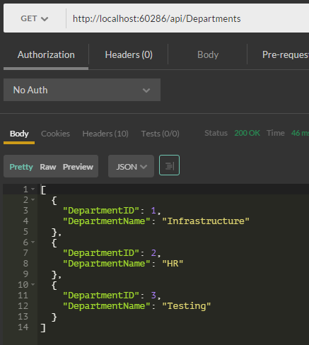 Figure 15 POST: api/Departments – add the new record in department using this API,