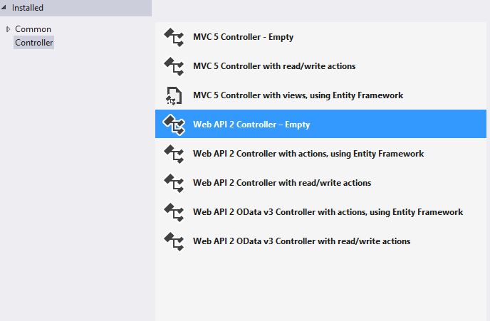 Right-click on the controller folder, select Add, then click Controller. Create a Web API 2 controller as in the following figure: