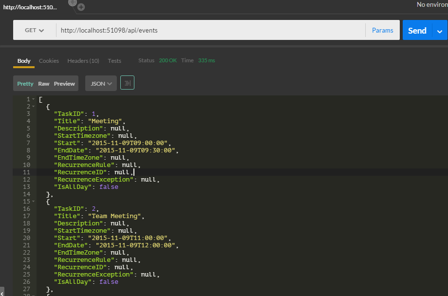 The Api/Events service response in POSTMAN as in the following figure: