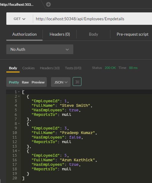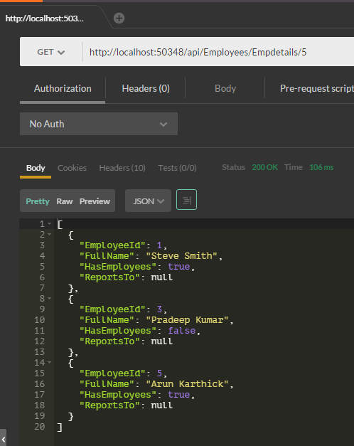 From the above image it is clear that the api/Employees/Empdetails API gives you the details of employees who doesn’t have the report to value,