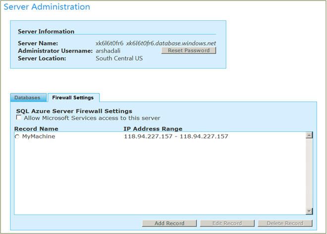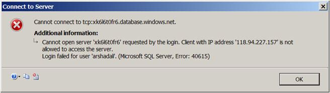 You will get the preceding error the first time when connecting to the SQL Azure database. For that you must add your IP address into the SQL Azure live portal. The following picture shows that.