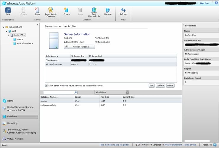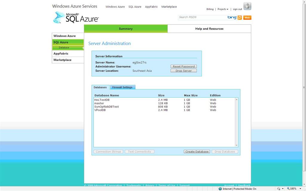 SQL AzureMicrosoft SQL Azure is a sub component of Windows Azure and its extend SQL Server capabilities to the cloud. SQL Azure offers a relational database service called Microsoft SQL Azure Database. Once you have an Azure account using Windows you can log into the Azure portal and land at the following page. Using this web page you are able to create a database and modify some settings about the database. But you can drill down to the table, row and column level. The next picture will list the same features, entirely developed by Silverlight.
