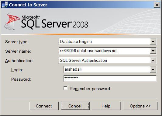 Once these scripts are generated, open SQL Server 2008 edition and connect to the SQL Azure Server using Live credentials then execute the following scripts. This is shown in following pictures.