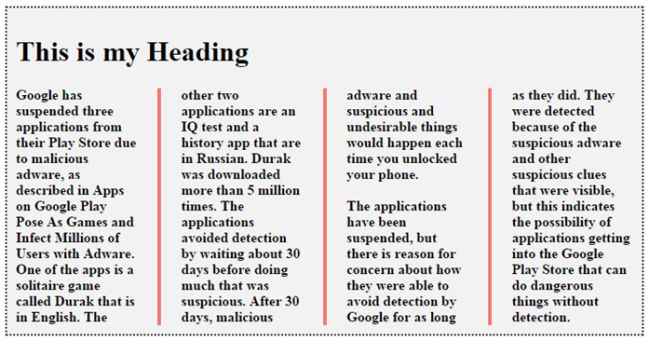 Let's see each of the preceding properties with an example to make the concept clear. First we'll create 4 columns using the "column-count" property as shown in the following code.