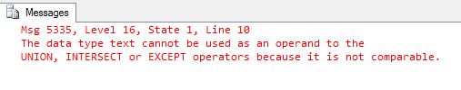 When we use a UNION for the TEXT type columns, SQL Server throws a runtime error. This error is not generated when we use the “UNION ALL” operator.
