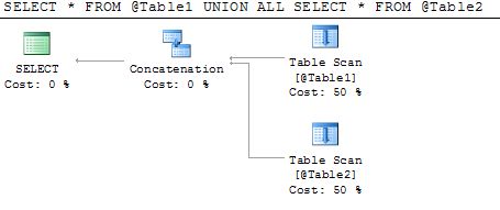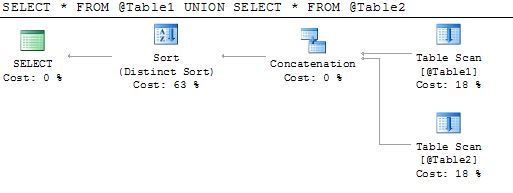 A UNION operator does a DISTINCT on the result set, SQL Server automatically does a distinct sort operation on the result set. Consider the following execution plan, in this execution plan we can see that the distinct sort is taking 63% of the time of the actual execution time.