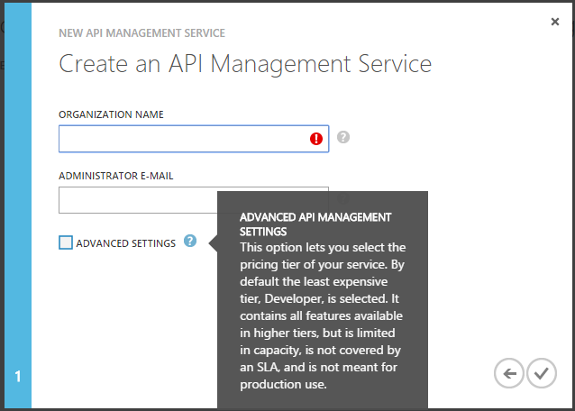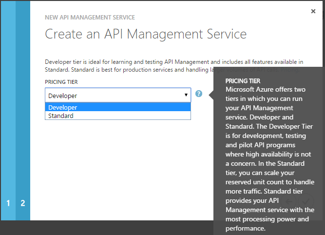 - The API Management service instances that are available are Developer, Standard and Premium. By default, new API Management service instances are created using the Developer tier. To select the Standard or Premium tier, check the advanced settings checkbox and select the desired tier on the following screen.