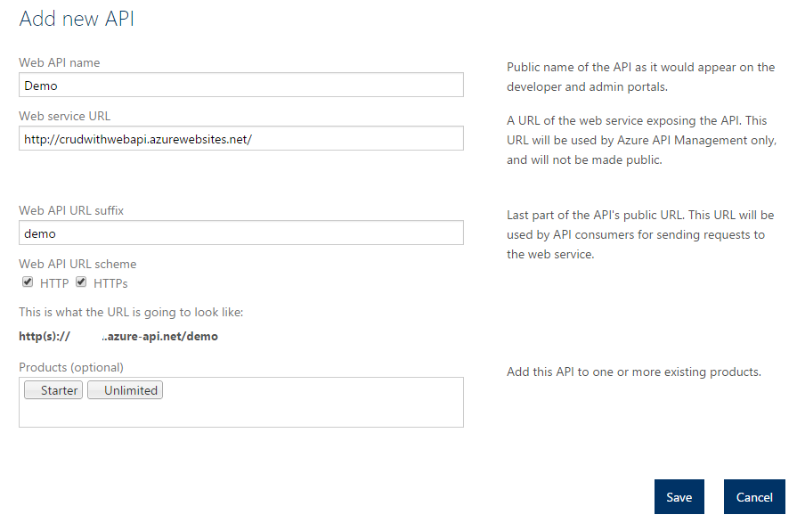 - We provide an actual address where our WEB API is hosted, please refer to the preceding section, where we discussed the deployment of our WEB API to Azure. http://crudwithwebapi.azurewebsites.net/ into the Web service URL. Web service URL references the HTTP service implementing the API. The API management forwards requests to this address.