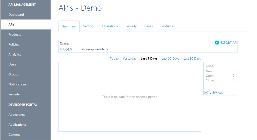 - We provided a suffix as "demo" for our API. The Web API URL suffix is appended to the base URL for the API management service. Our APIs will share a common base URL and be distinguished by a unique suffix appended after the base.
