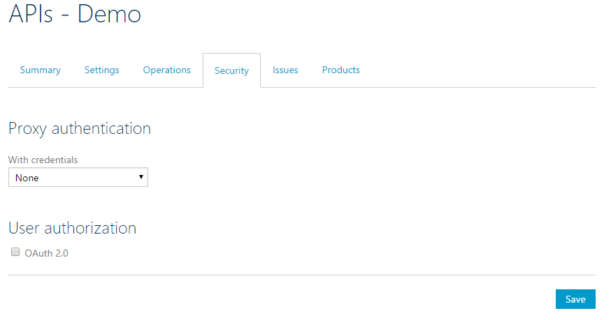 - The Settings tab is used to view and edit the configuration for an API, including authentication credentials for the back-end service.