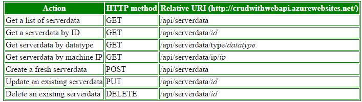 - URL template: our actual resource of Web API (as specified in the preceding table).