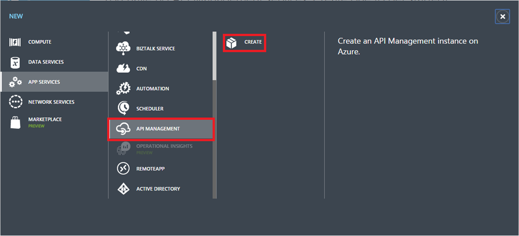 - Click New, App Services, API Management, Create.