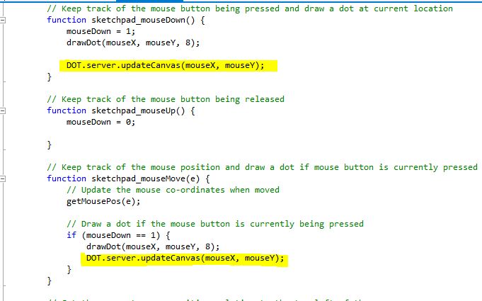 - The UpdateDot function is called from the server to update the drawing on the canvas (NOTE: In the server code, the updateDot is in camelCase like UpdateDot).