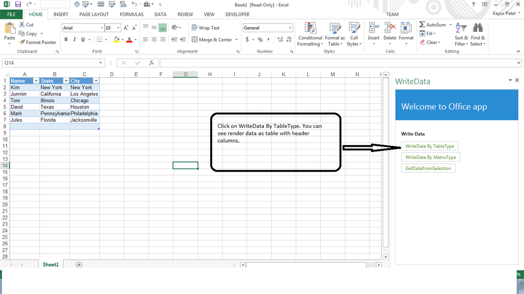 writeData By TableType button in the task pane. Ensure that your table should be created in Excel before the button click. You can see the data in the table type binding as shown in the following screen shot.