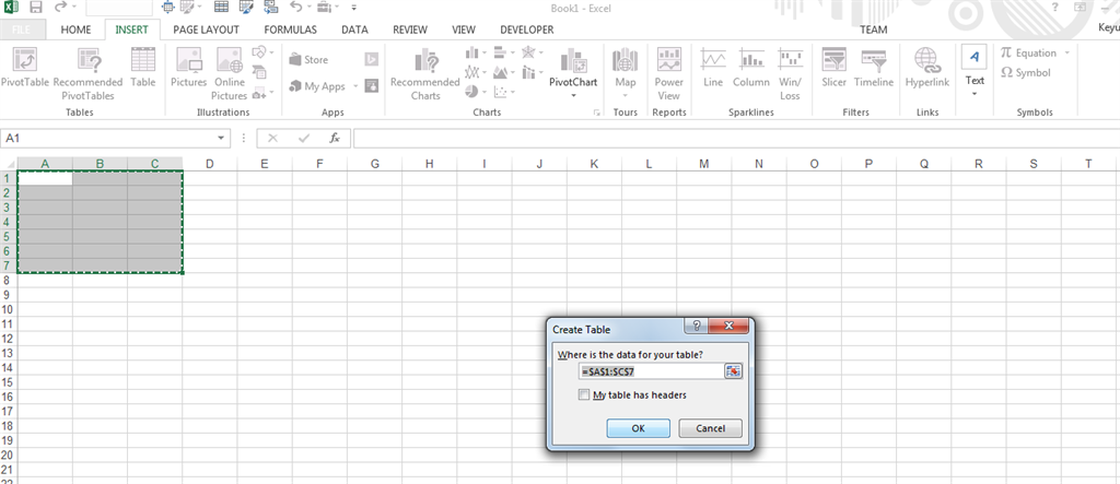 You need to pass the table name as the name parameter in the addFromNamedItemAsyn method. Pass table as the binding type in the second parameter, specify the unique name ("DataTableId") to be used to identify the binding object. To create a table in Excel, select cells where the user wants to render the data. Go to the Insert tab then click on Table. A Popup will be opened as shown in the following screen shot to assign a meaningful name for a table in the Excel UI.