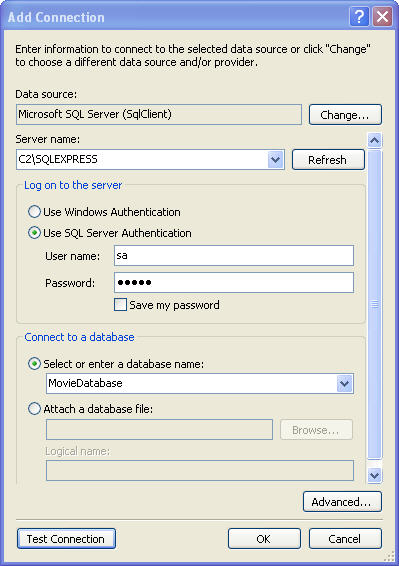Click on the Server Explorer and add a new data connection. Specify MovieDatabase as the selected database.