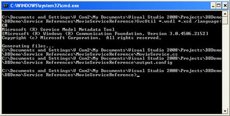 We begin with adding a service reference to MovieService. To do this, right click on the project, DBDemo and select Add Service Reference. Click Discover and then select MovieService.svc after it is shown in the Add Service Reference dialog box. Rename the service reference to MovieServiceReference. To generate a client class that can consume the service, use the SvcUtil tool as shown in Figure 5. This tool is typically found in the C:\Program Files\Microsoft SDKs\Windows version xx folder where xx may change based on your machine configuration. To use it in your current application directory, give the following: