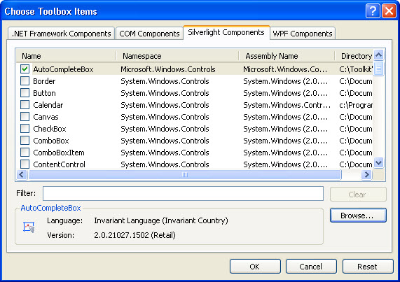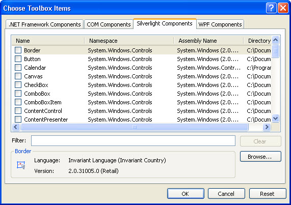 This will launch the Choose Toolbox Items dialog box. We select the Silverlight Components tab in the dialog box.