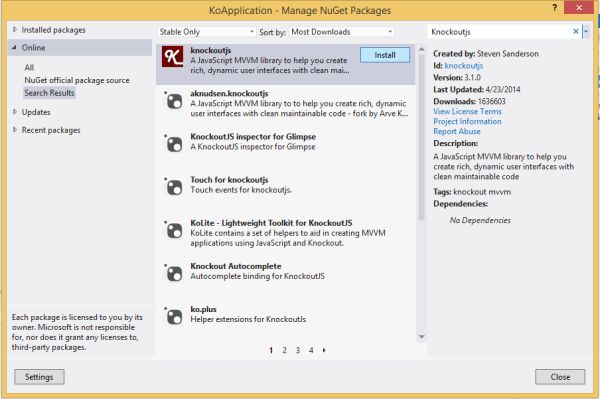 You will get knockoutjs as the first option. Click on Install.