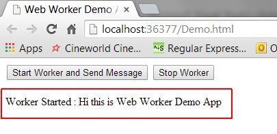 Now click on the first button that says "Start Worker and Send Message" and you can see your worker is started and passed the message.