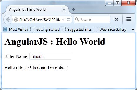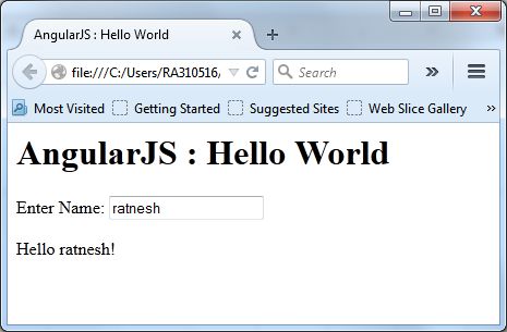 Now note the line <div ng-app=""> where “ng-app” indicates that we have an angular application in the <div>. It is also used to load various AngularJS modules into the AngularJS Application. “ng-model” helps to bind the values of AngularJS application data to HTML input controls. The {{ }} expression is an AngularJS data binding expression. Here we can also use “ng-bind” to bind the model value to our HTML page.