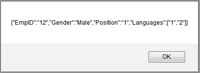 If we submit our form with all valid values then we would get an alert that shows all the values in a JSON string as: