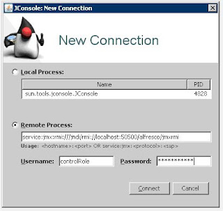 JMX url : service:jmx:rmi:///jndi/rmi://localhost:50500/alfresco/jmxrmi