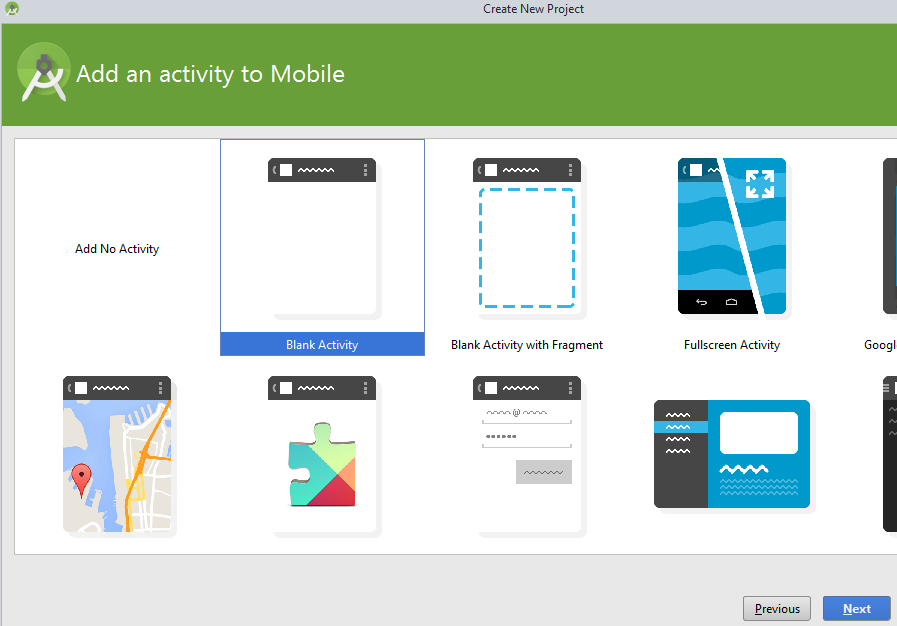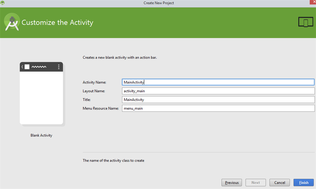 Click Next and by default, a blank activity with name MainActivity will be displayed,