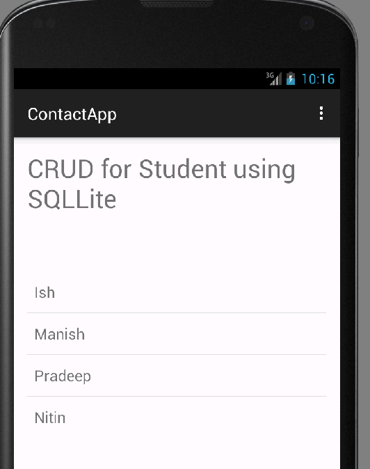 In MainActivity.java class, first, create an object of DBHelper class. Using the getAllStudentContacts method, bind the listview objects with the student name.