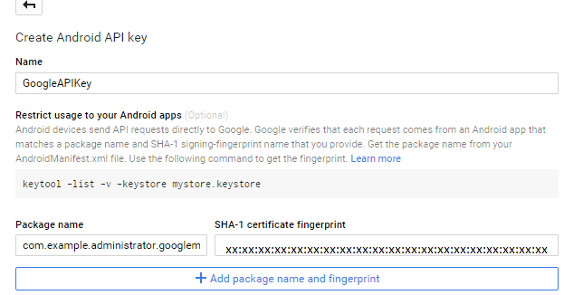 Enter the SHA-1 certificate fingerprint in the "Create Android API Key" option.