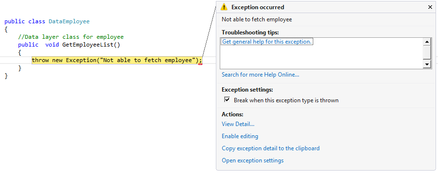 Now if you run the code above by putting it into the respective layer then when exception is thrown by the actual code debugger break execution in the front layer code. The following image shows that.