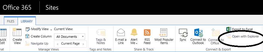 - For document library from “LIBRARY” section use “Open with Explorer” option and copy all the documents.