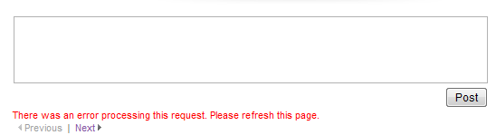 But we encountered an issue in one of our environments. The user tried to delete his/her post, but wasn't able to do so. Instead, he got the following exception: "There was an error processing this request. Please refresh this page" as shown in the following screenshot.