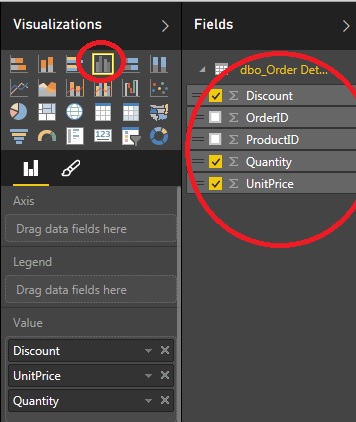 Now select that columns you want to display in report and select visualization. I am selecting Discount, Quantity and UnitPrice columns.