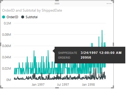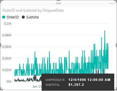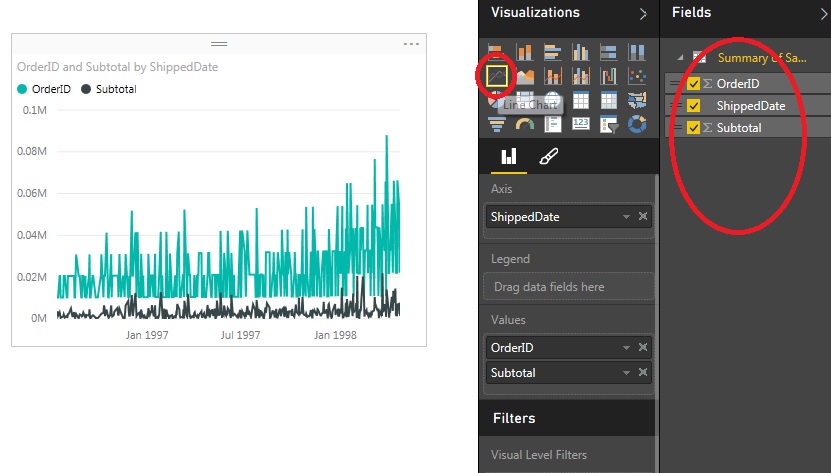 I have selected Line Chart and the three columns from the table, Order ID, Shipped Data and Subtotal.