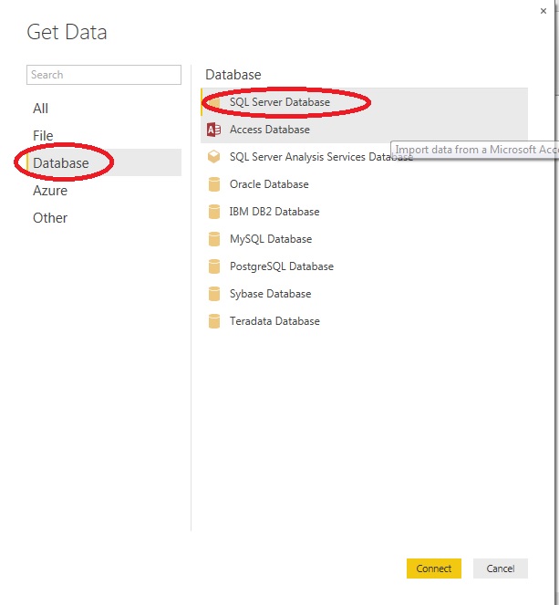 On the Get Data dialog, you can see a list of available data sources. Select Database in the left bar and select SQL Server Database and click the Connect button.