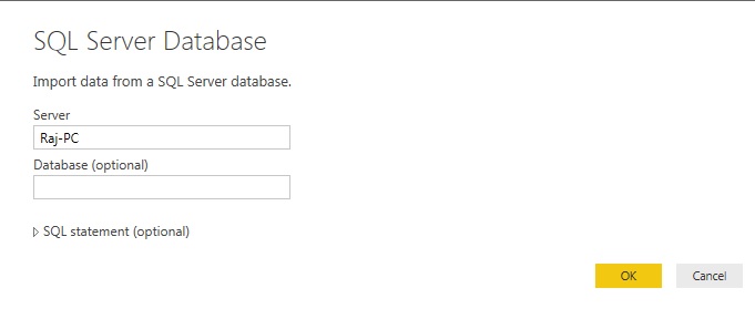 Now enter the SQL Server name and database (optional) and click the OK button.