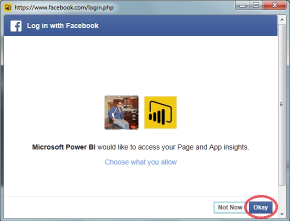 Power BI needs to access your Facebook public details like profile, friend list, email address, Timeline posts, status updates, personal description and likes and click Okay button.