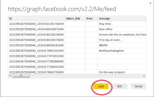 Here you can see list of all Facebook feed messages, Click Load button.
